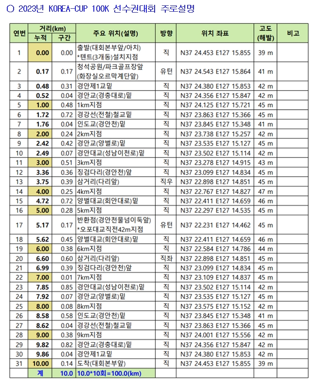 10. ´ëȸ ÀÏÁ¤ ¤· ¼±¼öµî·Ï - 100km : 11.11.(Åä) 16:00 ~ 16:30 - 50km : 11:11.(Åä) 21:00 ~ 21:30 ¤· ½ÄÀüÇà»ç : 11.11.(Åä) 16:30 ~ 16:50 ¤· ´ëȸÃâ¹ß - 100km : 11.11.(Åä) 17:00 - 50km : 11.11.(Åä) 22:00 ¤· ´ëȸÁ¾·á - 100km : 11.12.(ÀÏ) 08:00 - 50km : 11.12.(ÀÏ) 06:00 ¤· ½Ã»ó½Ä : 11.12.(ÀÏ) 08:20 11. ´ëȸ ¿î¿µ ¤· µ¿¹ÝÁÖ ±ÝÁö : Âü°¡ ¼±¼ö°£ ¾î¶°ÇÑ °æ¿ì¿¡µµ µ¿¹ÝÁÖ´Â Çã¿ëÇÏÁö ¾ÊÀ½. - Àå¾Ö¿ìÀÇ °æ¿ì º°µµ ±ÔÁ¤¿¡ ÀÇÇÔ - 1ȸ °æ°í : 10km¸¦ °°Àº ÆäÀ̽º·Î ÇÔ²² ´Þ¸± °æ¿ì - 2ȸ °æ°í ½Ã ÅðÀå Á¶Ä¡ÇÔ ❈ ´Ü µ¿¹ÝÁÖ ¿¹¿ÜÀÎÁ¤ : '³²+³²', '¿©+¿©' µ¿¹ÝÁÖ´Â ¿¹¿ÜÀûÀ¸·Î Çã¿ë ¤· ¹è¹ø ºÎÂø - ÁÖÀÚ´Â ¾Õ¡¤µÚ·Î ¹è¹øÀ» ºÎÂøÇÏ¿©¾ß ÇÔ. - À¯´ÏÆû ±³Ã¼½Ã¿¡µµ ¹è¹øÀº ¹Ýµå½Ã ¾Õ¡¤µÚ·Î ºÎÂøµÇ¾î ÀÖ¾î¾ß ÇÔ. ¤· ÁöÁ¤Åë·Î - Ãâ¹ßÁö ÁöÁ¤Åë·Î¸¦ ÅëÇØ¼¸¸ ÃâÀÔ°ú ÈÞ½Ä °¡´É - ±âŸ ±× ¿ÜÀÇ Áַο¡¼ °¨µ¶°ü ½ÂÀÎ ¾øÀÌ ÀÓÀÇ·Î Áַθ¦ ÀÌÅ»ÇÏ´Â °æ¿ì 1ȸ °æ°í, 2ȸ ÅðÀå Á¶Ä¡ÇÔ. ¤· ±â·Ïüũ - ¹è¹øÀº 2ÀåÀÌ Áö±ÞµÊ. - ¹è¹øÀº ¾ÕµÚ ºÎÂøÇÏ¿©¾ß ÇÏ¸ç º¸°ü¹°Ç°¿¡´Â º°µµÀÇ Ç¥½Ã°¡ Áö±ÞµÊ. - ¹è¹ø¿¡ 5km´ÜÀ§ Åë°ú üũ¸¦ ÁøÇà¿ä¿øÀÌ ÇÔ. - üũÆ÷ÀÎÆ®¿¡¼ ÇÊÈ÷ ¹è¹ø¿¡ üũ¸¦ ¿Ï·áÇÏ°í °æ±â¸¦ ÁøÇàÇÏ¿©¾ß ÇÔ. (¹Ìüũ½Ã ±â·ÏÀÎÁ¤ ¾ÈµÊ) - Ĩ »ç¿ë½Ã º°µµ ±ÔÁ¤À» µÒ. 12. ½Ä»çÁ¦°ø(±Þ¼ö´ë °£½Ä º¸±Þ) ¤· ´ëȸ½Ã - 100km ÁÖÀÚ: 50km¿¡¼ ½Ä»ç Á¦°ø(¿ÀÈÄ 10½ÃºÎÅÍ ¿ÀÀü 1½Ã±îÁö) - ±âŸ : 5km ´ÜÀ§ ±Þ¼ö´ë ¼³Ä¡, ½Ä¼ö/ÀÌ¿ÂÀ½·á ¹× ¾à°£ÀÇ ´Ù°ú Á¦°ø ¤· ´ëȸÈÄ : 50km/100km Âü°¡ÀÚ Àü¿ø ½Ä»çÁ¦°ø(¿ÀÀü 5½ÃºÎÅÍ 8½Ã30ºÐ±îÁö) ¡¡ 13. »þ¿ö½Ã¼³ ¾È³» ¤· À§Ä¡ : ±¤ÁÖ ½Ã³» Ȳ±Ý »ç¿ì³ª(´ëȸÀå¿¡¼ 10ºÐ°Å¸®) ¤· ¿ä±Ý : »ç¿ì³ª 7,000¿ø, ÂòÁú¹æ 8,000¿ø(°³Àκδã) 14. ´ëȸÀå ¿À½Ã´Â ±æ ¤· Àüö : °æÀüö ±¤ÁÖ¿ª ÇÏÂ÷(´ëȸÀå±îÁö 1.6km) ¤· ¹ö½º : ¹ö½ºÅ¸°í ¾Û ÀÌ¿ë (Ãâ¹ßÁö ~ °æ±â ±¤Áֽÿܹö½º Å͹̳Î) ¤· ±âŸ : º°µµÀÇ ÁÖÂ÷½Ã¼³ ¾øÀ½(´ëÁß±³Åë ÀÌ¿ë ¿ä¸Á) 15. ȸ¼öÂ÷·® ¤· º°µµÀÇ È¸¼öÂ÷·® ¾øÀ½(¹ÝȯÄÚ½ºÀ̹ǷΠÆ÷±â½Ã ´ëȸº»ºÎ¿¡ ÀÚ·Â ±Íȯ) ¤· Æ÷±â½Ã ´ëȸ¿î¿µº»ºÎ¿¡ ÇÊÈ÷ Å뺸ÈÄ º¸°ü¹°Ç° ¼ö·É ¡¡ 16. ÁÖÀÚ Çʼöǰ¸ñ ÁöÂü Áؼö ¤· Çìµå·»ÅÏ ¶Ç´Â ¼ÕÀüµî : 2°³Áß Çϳª´Â ¹Ýµå½Ã ÁöÂü - Çìµå·»ÅÏ ¶Ç´Â ¼ÕÀüµîÀº Çʼö ÁöÂü ǰ¸ñÀÓ. - °æ¾ÈõÀº ¾ß°£ Á¶¸íÀ¸·Î ÇÏõÀ§ µµ·ÎÀÇ °¡·Îµî ºÒºûÀ¸·Î ÁÖ·Î ½Ã¾ß´Â È®º¸µÇ´Â ¼öÁØÀ̱â´Â Çϳª, ¾ß°£ ½Ã·ÂÀÌ ¾àÇÑ ºÐµéÀÇ ¾ÈÀü ´ãº¸¿¡´Â ¾à°£ ¹ÌÈíÇÑ Á¶¸í»óÅÂÀÓ. ¤· ¹è³¶: Âø¿ë ±ÇÀå»çÇ×À¸·Î ¹è³¶¾øÀÌ ´ëȸÁøÇàÀº °¡´ÉÇÔ. 17. ±âŸ ¤· ´ëȸ Ãâ¹ß½Ã °¡º¿î º¹ÀåÀ¸·Î Ãâ¹ßÈÄ ³¯¾¾ º¯È¿¡ µû¸¥ ¹Ù¶÷¸·ÀÌ °Ñ ¿Ê Çʼö ¤· ´ëȸ µî·Ï½Ã ¸Ã±â½Å º¸°ü°¡¹æÀº ´ëȸÁß ºÒÃâ ºÒ°¡, ¶ÇÇÑ ±ÍÁßǰÀº º¸°ü ºÒ°¡ ¤· °Ñ¿Ê ¹× ÁÖÀÚ ÇÊ¿ä ¹°Ç°Àº °³Àκ° º¸°ü ºñ´Ò µî¿¡ ´ã¾Æ ÁöÁ¤µÈ Àå¼Ò¿¡ º°µµ·Î º¸°üÇÏ¿© ÇÊ¿ä½Ã ã¾Æ¼ »ç¿ëÇÏ½Ã¸é µÊ(ºñ´Ò µî Æ÷ÀåÀç·á´Â °³ÀÎÀÌ Áغñ). ¤· ÁÖÀÚÇÊ¿ä ¹°Ç°Àº Á¶Á÷À§¿¡¼ µû·Î Á¢¼ö¸¦ ¹Þ°Å³ª ºÒÃâÀº ÇÏÁö ¾ÊÀ¸¸ç, ºÐ½Ç½Ã Á¶Á÷À§¿¡¼ Ã¥ÀÓÁöÁö ¾ÊÀ½. ¤· ÁÖÀÚ ±âÈ£½ÄǰÀº °³ÀÎÀ̳ª Áö¸Í¿¡¼ ì°Ü ¿À½Ã°í.±âº»ÀûÀÎ ¹°, À½·á µîÀº ´ëȸº»ºÎ¿¡¼ ¼ö·ÉÇϽʽÿÀ(º°µµ·Î ´ëȸº»ºÎ¿¡¼ ÁغñÇÑ Ç°¸ñÀ» °øÁöÇϵµ·Ï ÇϰÚÀ½). ¡¡ 2023 KOREA CUP ¼±¼ö±Ç ´ëȸ Á¶Á÷À§¿øÈ¸ À§¿øÀå µå¸². |